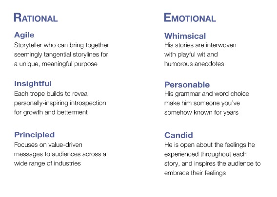Website content and campaigns use his phrases and idioms–supported by quick sharing features. For the New Bookers and Browsers who want to find a match for their conference, they filter his talking topics for easy sharing and discover samples on YouTube. For Recurring Bookers who want to stay close to him, we prioritize the newsletter and blog subscriptions, and promote related products. At every step, we maintain a quick way to book or buy when people find relevant content.