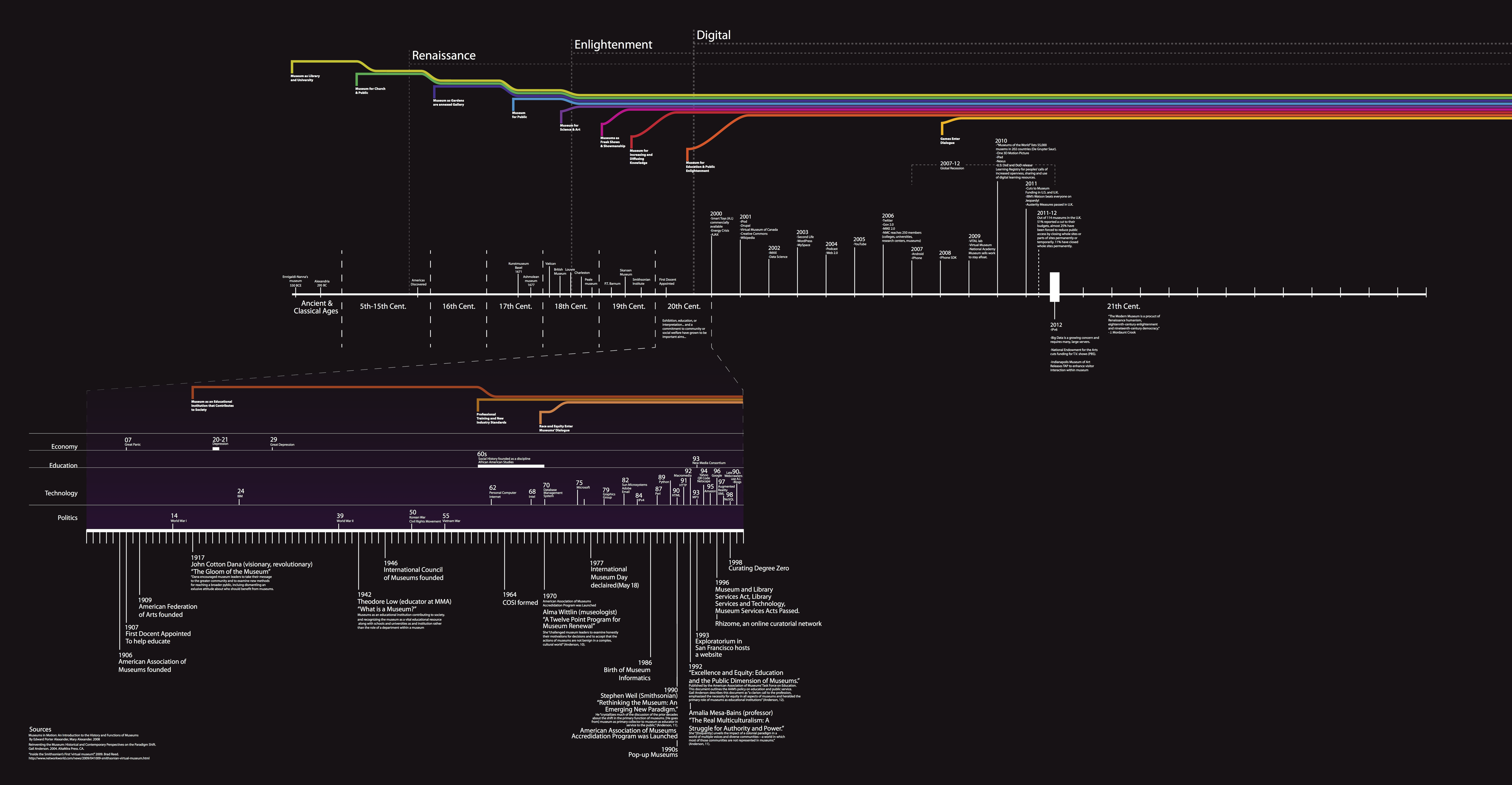 - How museums evolved in their definitions and uses against the backdrop of various environments. We sifted through all the literature we could find on the history of museums and began plotting a timeline.